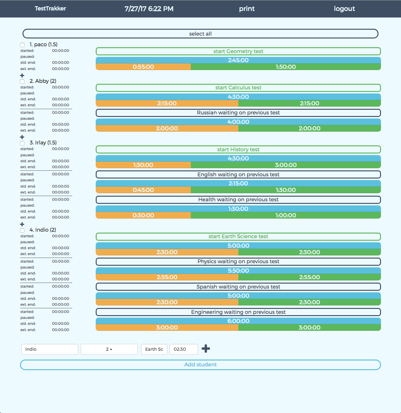 a special education test proctoring tool devised to keep track of students' testing times. The app is ready to use. It is attached to a Firebase database and authenticates with Facebook OAuth authentication.